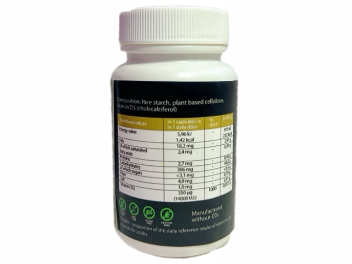 Vitamin D3 :hàm lượng lên đến 7.000 IU (thông thường chỉ có 500-1.000 IU được tìm thấy trong các sản phẩm). Sản phẩm được làm từ vitamin D3 cấp dược phẩm tinh khiết hiện nay. Vitamin D3 là cần thiết cho sự hấp thụ canxi thích hợp.Bổ sung vitamin D3 giúp vận chuyển canxi trong cơ thể, nơi nó hoàn thành chức năng của nó (xương, khớp, v.v.). Vitamin D3 rất cần thiết cho hoạt động của hệ thống nội tiết tố và sản xuất năng lượng. Vitamin D3 cũng là một loại vitamin thiết yếu cho khả năng miễn dịch mạnh mẽ. Vitamin D3 giúp “thiết lập lại” nhịp sinh học và cải thiện. Sản phẩm không chứa chất phụ gia, thuốc nhuộm, thành phần GMO, gluten, đậu nành, sữa và các chất gây dị ứng. Sản phẩm thuần chay và được sản xuất không có CO2.